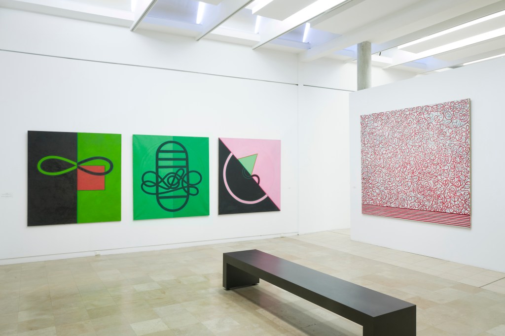 Il y a une physique discrète, pas toujours perceptible dans ces tableaux : le trait, toujours premier, est ensuite peint sur ses côtés, ce qui lui confère son tremblé, sa profondeur, mais il faut s’approcher pour réaliser la procédure lente qui lui donne cette allure de dessin « gravé dans la peinture » quand c’est la peinture qui s’est épaissie de part et d’autre. Travail du trait, on devrait dire labeur du trait, mais toujours aux aguets, malgré sa détermination, pour en accepter les accidents et les bifurcations.