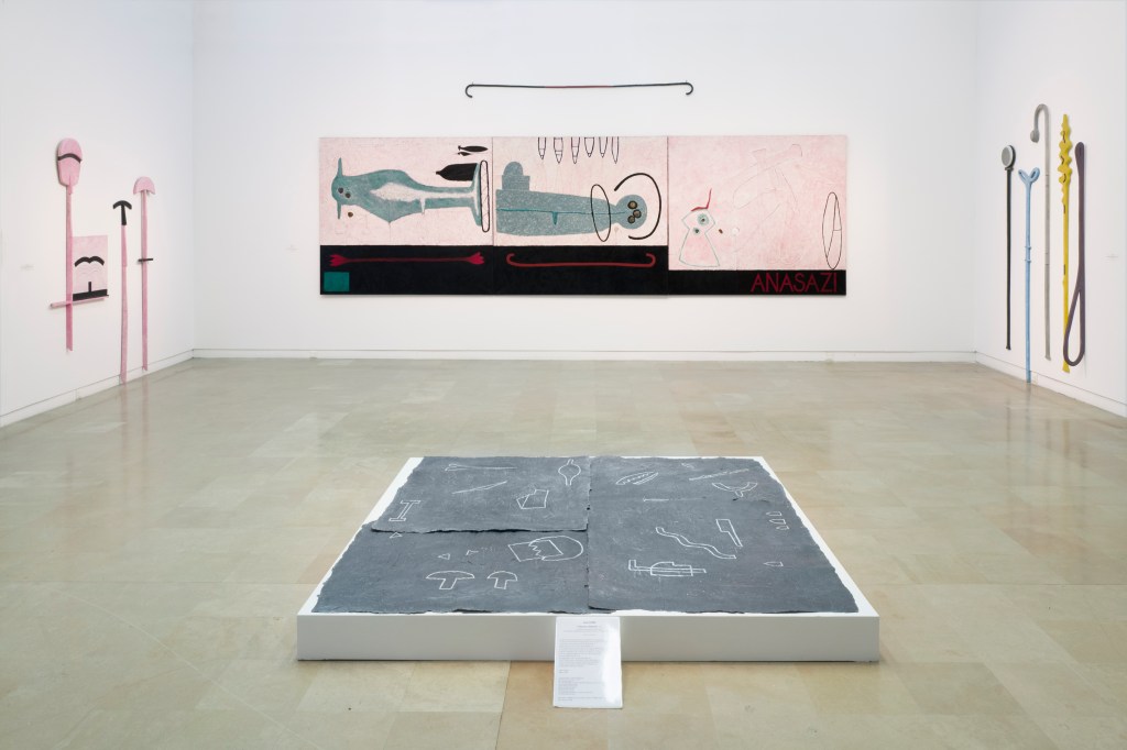 Plus précisément, il y a le symboliste et il y a l’artisan, l’idéaliste puisant aux sources les plus anciennes et l’amoureux des matériaux, à la fois rêveur et terrien : de fait, fabricant de rêves de terre. Un peintre du monde entier, mais d’avant la mondialisation ; un peintre de la terre et du ciel antérieurs aux dieux, ou tutoyant leur invention. Un homme dont l’incompréhension serait proche de celle des premiers hommes et qui aime la retrouver sur ses tableaux, qui aime en jouer avec des signes d’avant l’écriture. Développant un vocabulaire qui s’éloignera autant que possible de la lisibilité, bien que recourant souvent aux figures de base de toute symbolique : le cercle, le carré, l’ove, l’escalier etc.